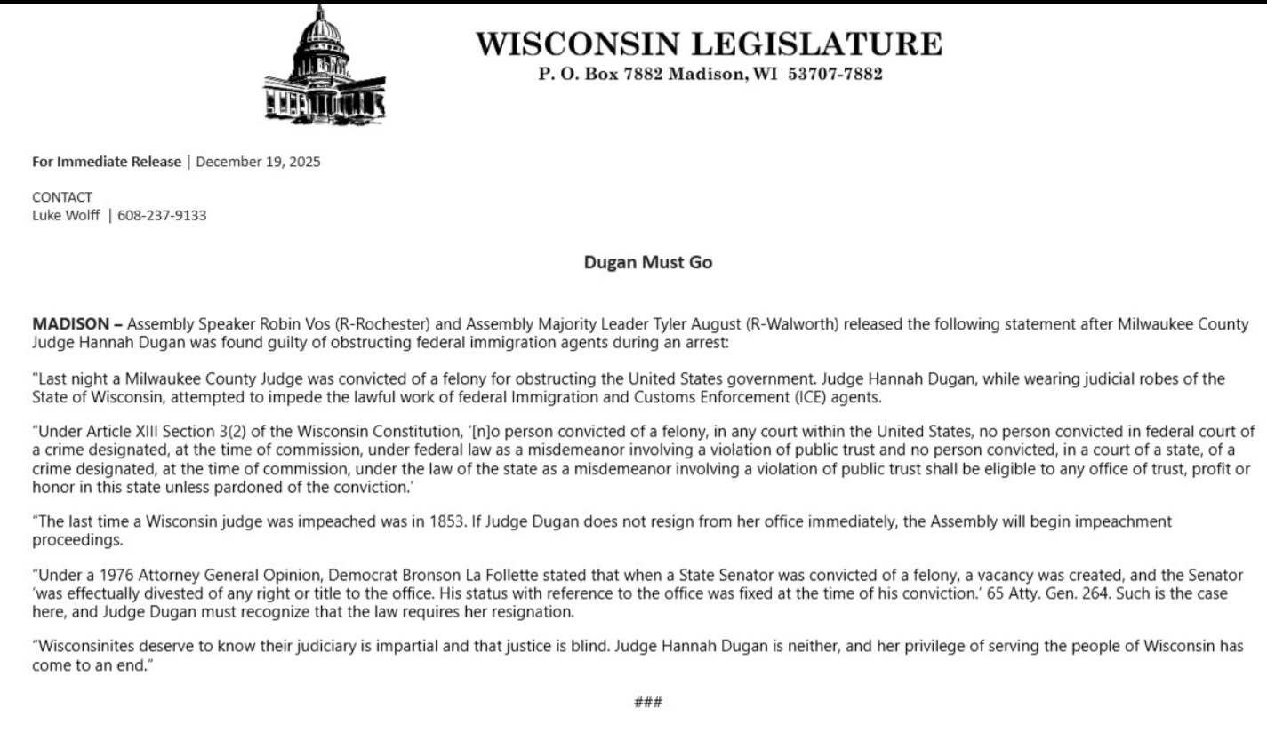 Assembly Speaker Robin Vos, R-Rochester, and Assembly Majority Leader Tyler August, R-Walworth, sent a statement Friday noting that the last Wisconsin judge was impeached in 1853 but that the Assembly would begin impeachment proceedings if Dugan doesn’t resign.