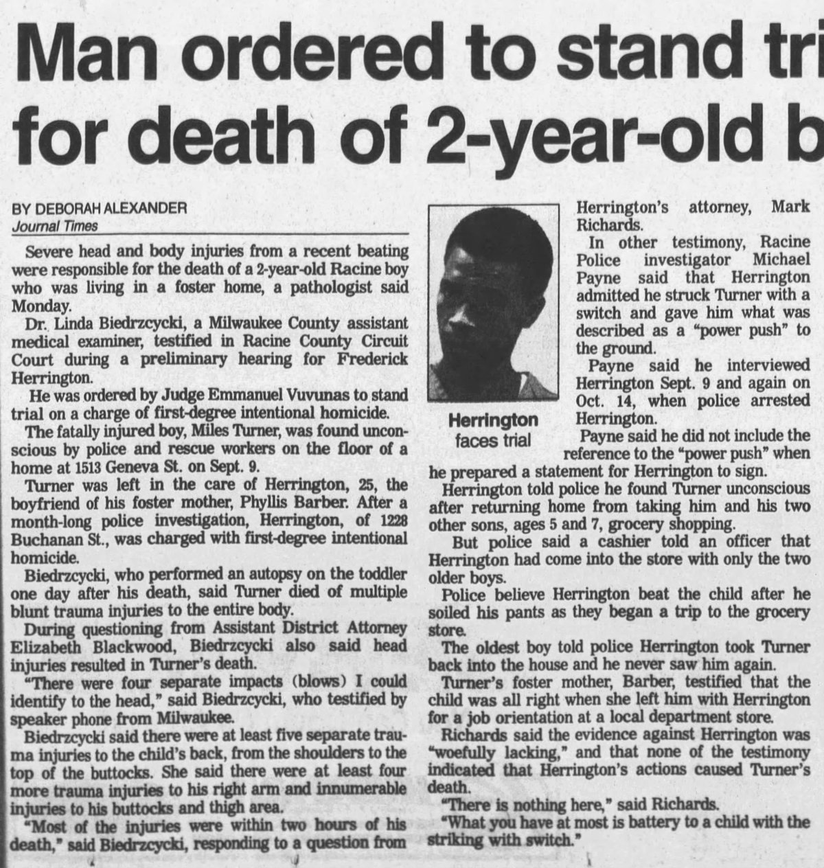 Frederick Herrington murdered his 2-year-old foster son, Miles Turner, in Racine in 1997 because the boy had soiled his pants.