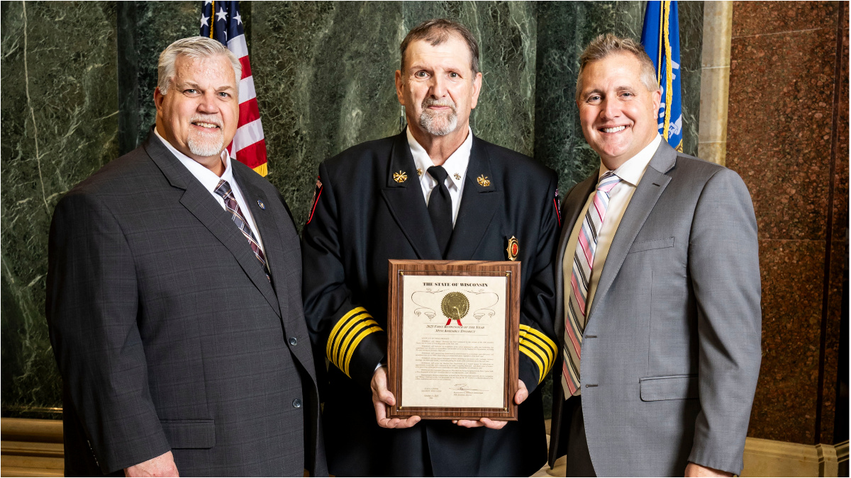 River Falls, WI — Representative Shannon Zimmerman (R–River Falls) and Senator Rob Stafsholt (R–New Richmond) recognized Hudson Assistant Fire Chief Jeff Dabruzzi as the 2025 First Responder of the Year during the October 14 floor session at the State Capitol.