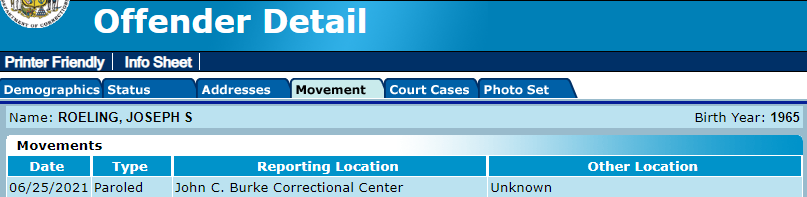 Date paroled: 06/25/2021 [You can check Roeling’s parole for yourself here. Put his name in the database, and click on “movement”]
