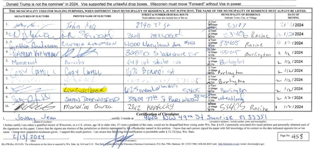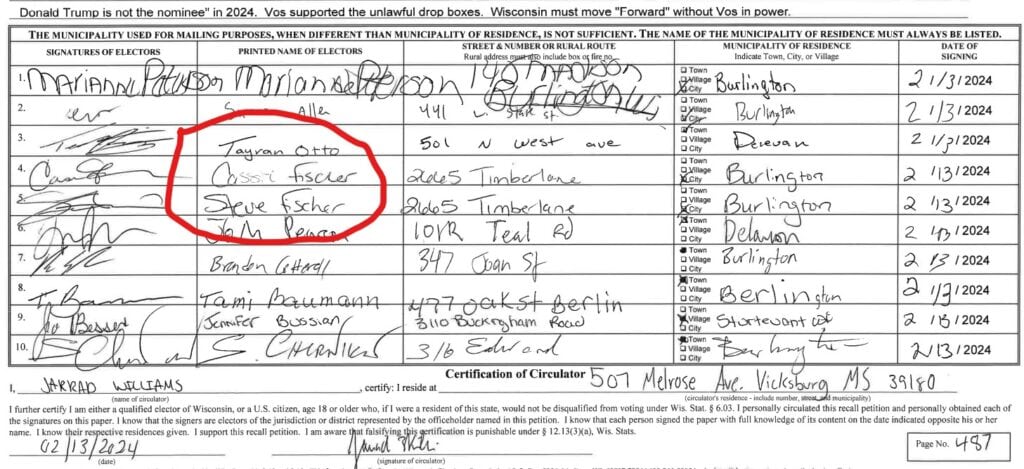 We found signatures from people who live in Muskego, Oconomowoc, Hartland, Cudahy, Oak Creek, and other Milwaukee-area suburbs that are far away from Vos’s district. Those signatures are invalid.