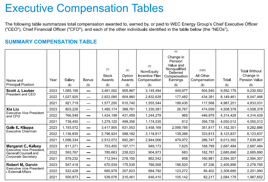For example, Scott J. Lauber, president and CEO of WEC Energy Group, earned $9,552,179 in 2023, the latest year available.
