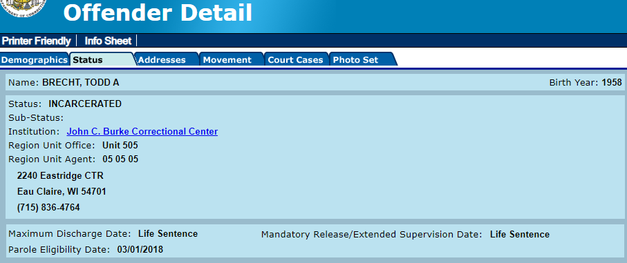 Brecht was paroled from the murder sentence on 11/9/2021, according to the Wisconsin Parole Commission. He is currently serving a sentence for escape. He briefly escaped from prison in 2013. He used a golf cart to escape a prison detail.